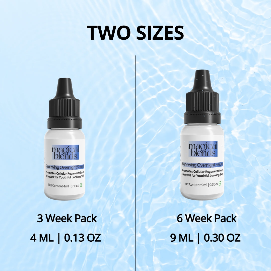 Usage - Add just 3-4 drops of Magical Blends Renewing Overnight Serum with the base of your choice - cream or gel. Add your desired Magical Blends serums to this and mix evenly to create your custom blend. Apply the mixture evenly to your face and neck.