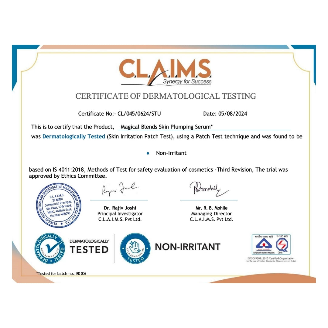 Usage - Add just 3-4 drops of Magical Blends Skin Plumping Serum with the base of your choice - cream or gel. Add your desired Magical Blends serums to this and mix evenly to create your custom blend. Apply the mixture evenly to your face and neck.