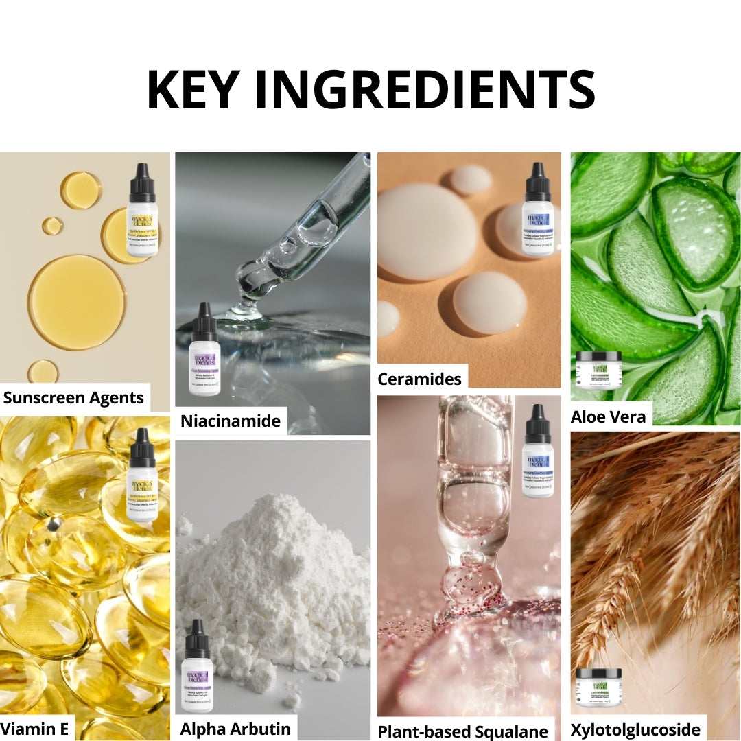 Key Ingredients - Key Ingredients - Medium Chain Triglyceride, Ethylhexyl Methoxycinnamate, Octyl Salicylate, Bis-Ethylhexyloxyphenol Methoxyphenyl Triazine, Butyl Methoxydibenz oylmethane, Butyloctyl Salicylate, Vitamin E, Niacinamide, Dictyopteris membranacea extract, Xylitylglucoside, Anhyroxylitol, Xylitoyl,Bellis Perennis (Daisy) Flower Extract, Arbutin, Brassica Campestris (Rapeseed) Seed Oil, Glycyrrhiza Glabra (Licorice) Root Extract, Althaea Officinalis Root Extract, Oryza Sativa (Rice) Bran Extract, Rosa Damascena (Rose) Flower Water,Aloe Barbadensis (Aloe vera) Extract, Xylitylglucoside, Anhydroxylitol, Xylitol, Magnesium Aspartate, Zinc Gluconate, Copper Gluconate